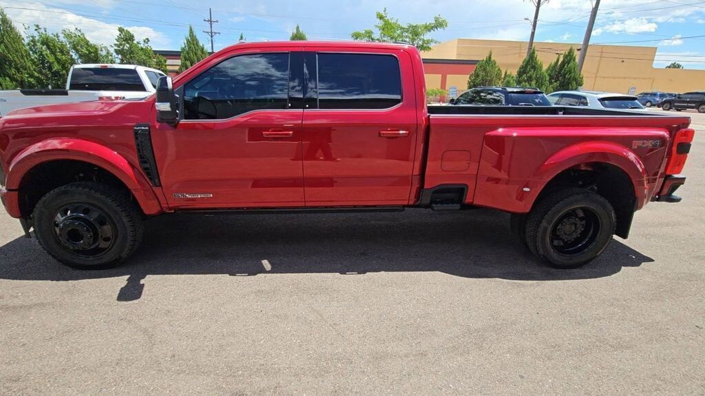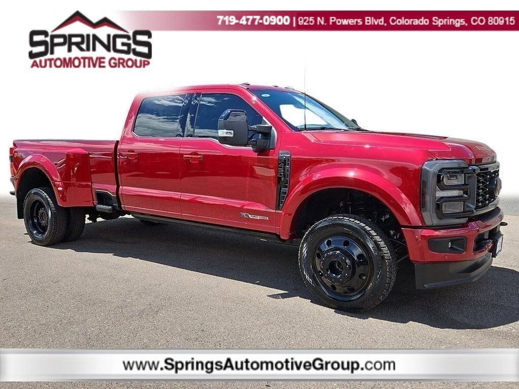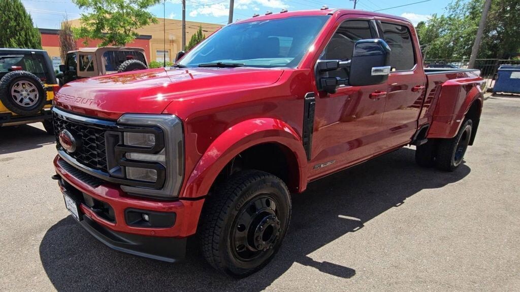 Red 2025 Ford F-450SD Platinum DRW 4WD 10-Speed Automatic Power Stroke 6.7L V8 DI 32V OHV Turbodiesel 4WD, ABS brakes, Alloy wheels, Compass, Electronic Stability Control, GVWR: 14,000 Lb Payload Package, Heated door mirrors, Illuminated entry, Remote keyless entry, Traction control.
