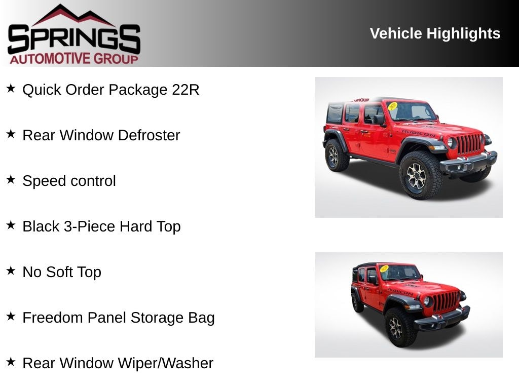 Firecracker Red Clearcoat 2020 Jeep Wrangler Unlimited Rubicon 4WD 8-Speed Automatic 2.0L I4 DOHC Black 3-Piece Hard Top, Freedom Panel Storage Bag, No Soft Top, Quick Order Package 22R, Rear Window Defroster, Rear Window Wiper/Washer, Speed control.