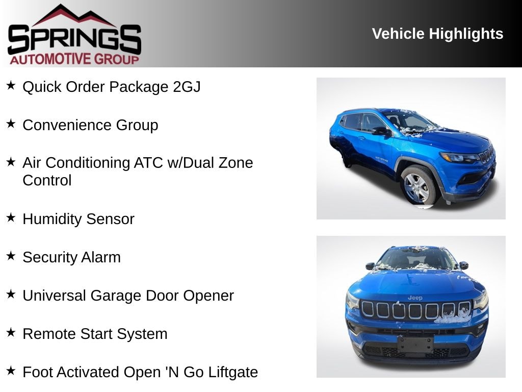 Laser Blue Pearlcoat 2022 Jeep Compass Latitude 4WD 9-Speed 948TE Automatic 2.4L I4 4WD, 115V Auxiliary Power Outlet, 2nd Row USB Type A/C Charge Only, Air Conditioning ATC w/Dual Zone Control, All-Season Floor Mats, Auto-Dimming Rear-View Mirror, Convenience Group, Foot Activated Open 'N Go Liftgate, Heated Front Seats, Heated Steering Wheel, Humidity Sensor, Leather Wrapped Steering Wheel, Power Adjust 8-Way Driver Seat, Power Liftgate, Quick Order Package 2GJ, Remote Start System, Reversible Carpet/Vinyl Cargo Mat, Security Alarm, Universal Garage Door Opener, Vehicle Information Center, Windshield Wiper De-Icer.