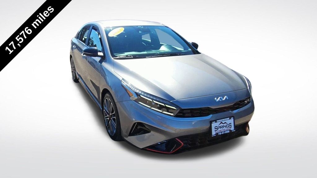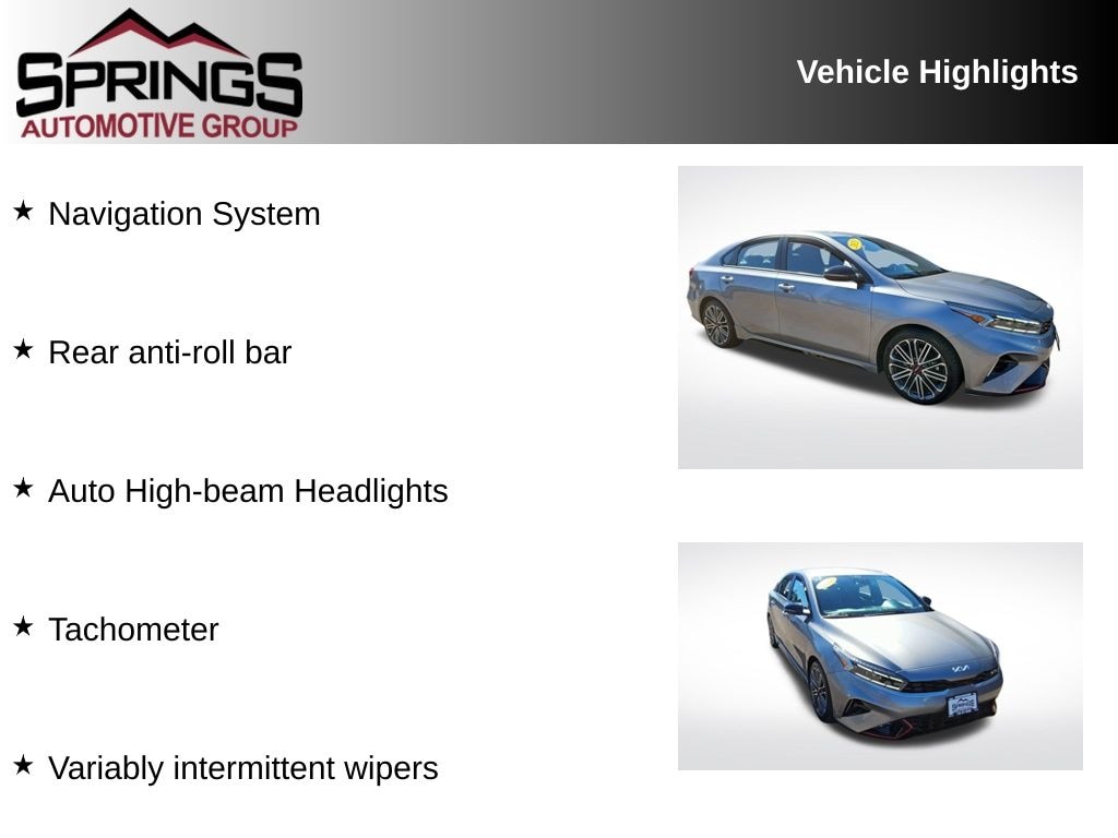 Steel Gray 2023 Kia Forte GT FWD 7-Speed Automatic 1.6L I4 Turbo Auto High-beam Headlights, Navigation System, Rear anti-roll bar, Tachometer, Variably intermittent wipers.