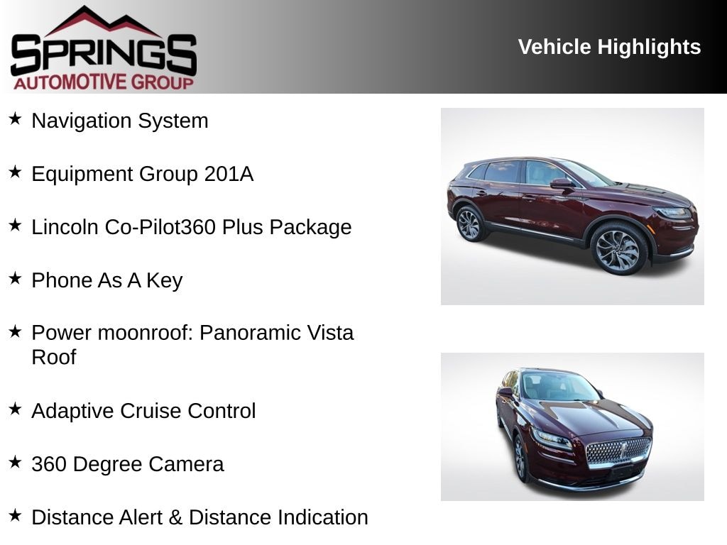 Burgundy 2021 Lincoln Nautilus Reserve AWD 8-Speed Automatic 2.7L V6 Twin Turbocharged 360 Degree Camera, Adaptive Cruise Control, Distance Alert & Distance Indication, Enhanced Active Park Assist, Equipment Group 201A, Evasive Steering Assist, Front Sensing, Lincoln Co-Pilot360 Plus Package, Navigation System, Phone As A Key, Power moonroof: Panoramic Vista Roof, Wheels: 20" Prem Painted Bright Machined Aluminum.