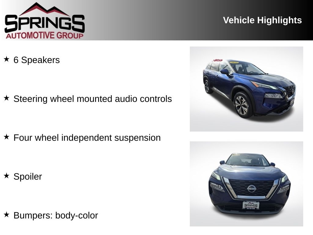 Caspian Blue Metallic 2023 Nissan Rogue SV AWD CVT with Xtronic 1.5L I3 Turbocharged DOHC 12V LEV3-ULEV50 201hp AWD, 6 Speakers, Bumpers: body-color, Four wheel independent suspension, Spoiler, Steering wheel mounted audio controls.