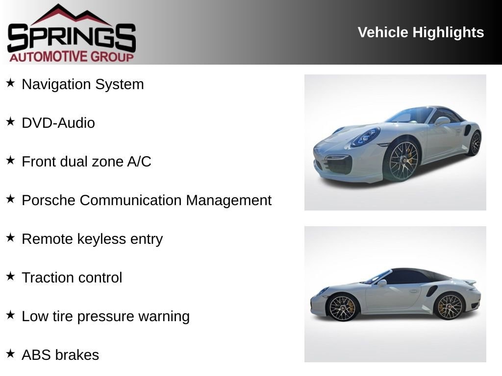 Transmission: 7-Speed Porsche Doppelkupplung (PDK), Transmission w/Driver Selectable Mode, Sequential Shift Control w/Steering Wheel Controls and Oil Cooler, Tire Specific Low Tire Pressure Warning, Tire Mobility Kit, Strut Front Suspension w/Coil Springs, Sport Leather/Metal-Look Steering Wheel, Sport Bucket Front Seats w/Leather Back Material, Side Impact Beams, Remote Releases -Inc: Power Cargo Access, Remote Keyless Entry w/Integrated Key Transmitter, 2 Door Curb/Courtesy, Illuminated Entry and Illuminated Ignition Switch.