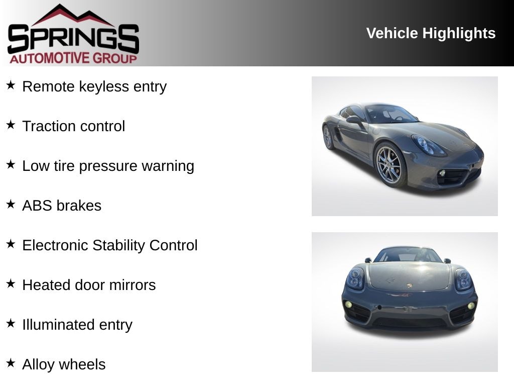 Agate Gray Metallic 2016 Porsche Cayman RWD 6-Speed Manual 2.7L H6 DOHC ABS brakes, Alloy wheels, Electronic Stability Control, Heated door mirrors, Illuminated entry, Low tire pressure warning, Remote keyless entry, Traction control.